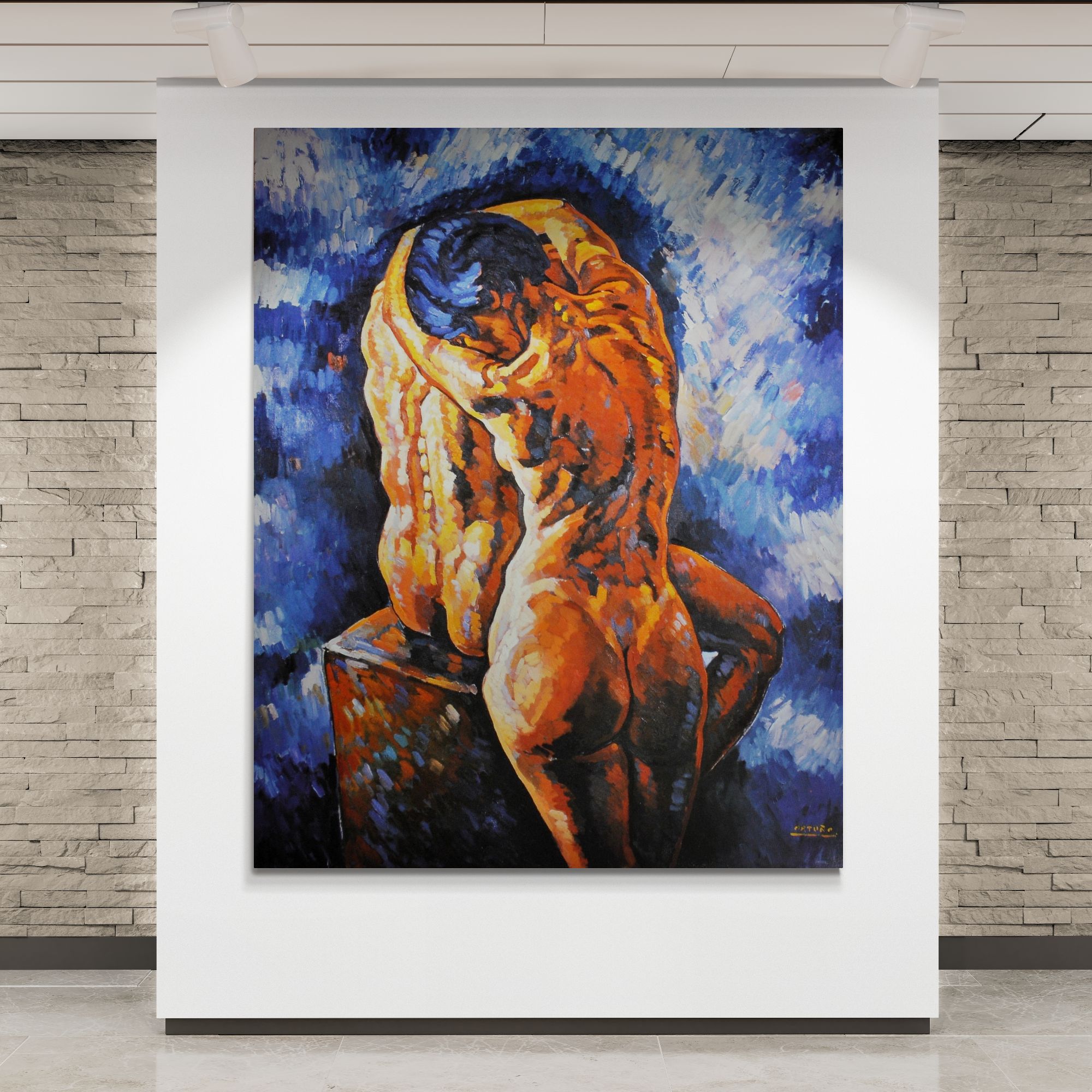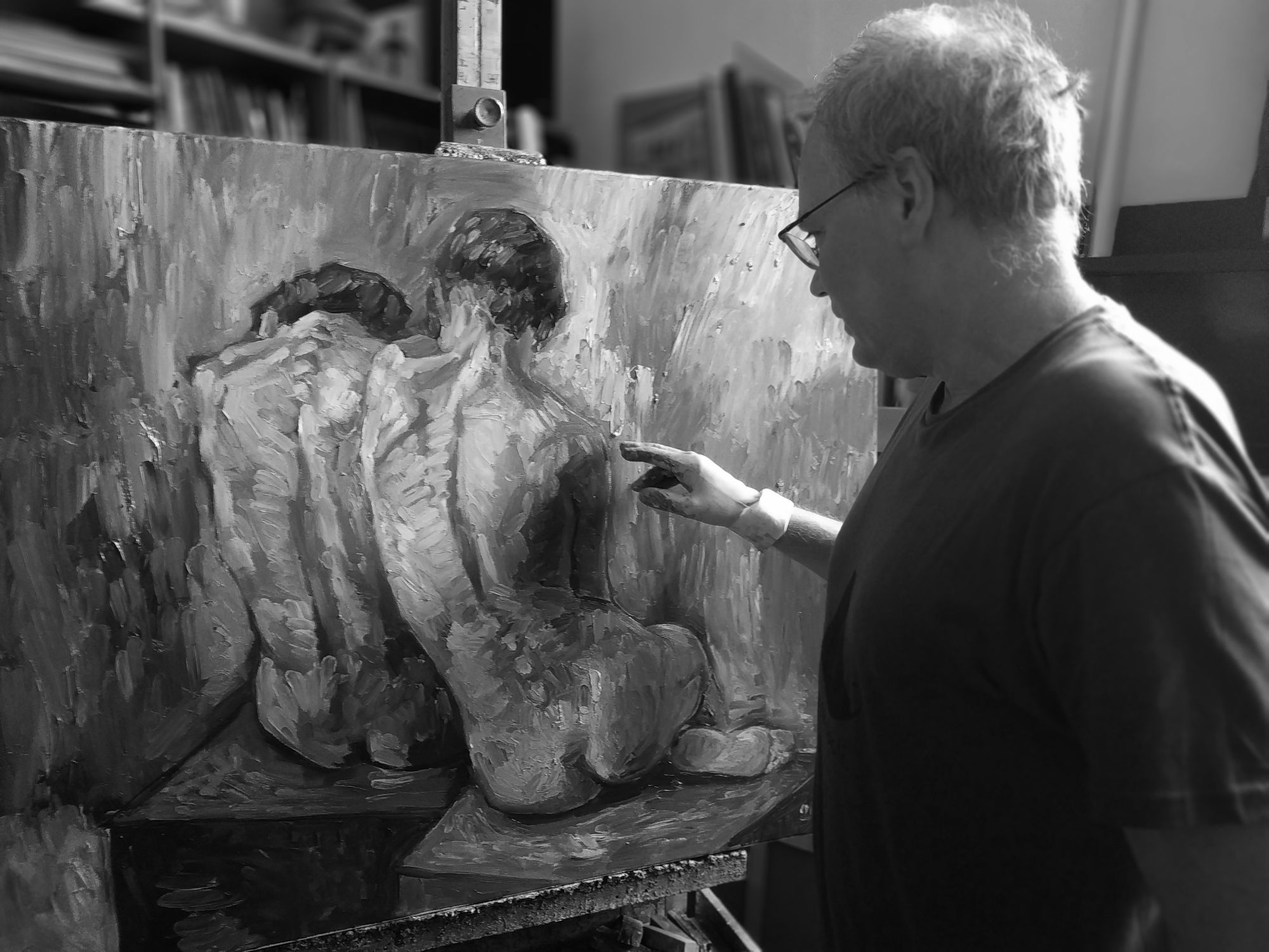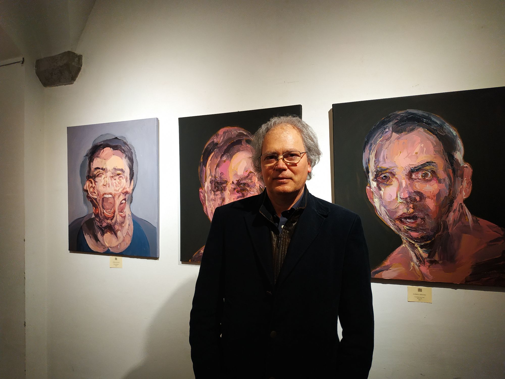 Biografia ( sintesi) Andrea Ortuño nato a Firenze nel 1963, si è diplomato nel 1988 all’Accademia di Belle Arti di Firenze in discipline pittoriche. Dopo il diploma si trasferisce a Barcellona, dove prosegue la sua esperienza nella pittura astratta; ma presto avverte nel clima artistico giovanile catalano, una stanca ripetizione di modelli espressivi contemporanei, già noti nella cultura italiana anni settanta. Successivamente matura la convinzione che un ciclo storico si è concluso; nel ’93 rientra in Italia, si stabilisce nel vecchio studio di suo padre a Firenze. Riparte con la pittura figurativa dopo la parentesi astratta della metà anni ottanta. Lavora ad opere di grandi dimensioni il cui soggetto principale è la figura umana, rappresentata attraverso il nudo di schiena, come le coppie, figure uomo-donna, una accanto all’altra, che formano un'unica forma chiusa, archetipa, dipinte prevalentemente in bleu e verde come ‘summa’ evocative dell’essere umano, esse sono avvertite come ‘emblemi’ del destino dell’uomo chiamate “Anthropos”. Anche nel soggetto delle nature morte trasporta quel senso di sospesa incertezza che anima i nudi; inizia il ciclo dei “Quartetti’, composizioni di mele o limoni, non più pensate come natura morta, ma bensì come pura forma e colore che trascende dall’immagine reale. Passa lunghi anni, come dirà il critico Mario Bucci, a creare il suo stile prima di apparire in pubblico. Nel ’95 espone alla “Galleria Cimabue” e, nello stesso anno, apre presso il suo studio una scuola di pittura sia per studenti dell’Accademia, sia per privati. Nel ’98 pubblica il catalogo “Opere” recensito dallo stesso Bucci; viene preso a lavorare in esclusiva per tre anni alla Galleria “Arte Mia” di Roberto Masi a Firenze, iniziano le prime esperienze con il mercato dell’arte, partecipa a numerose esposizioni in Italia, tra cui la Expo di Roma del 1998 ed a varie pubblicazioni su riviste d’arte tra cui “Arte Mondadori”. Nel 2000 passa alla “Galleria Paviglianiti” di Firenze, continuando la serie di esposizioni anche all’estero, come la Art Expo International di San Francisco U.S.A del 2000. La Art Expo International di New York del 2001 e la Art Basel, Miami (Florida) U.S.A del 2002. Seguiranno varie pubblicazioni sempre su “Arte Mondadori”. Nel 2004 espone alla galleria “Art Point Black” di Firenze e nello stesso anno fonda lo “Studio San Lorenzo” come scuola di pittura permanente. Nel 2007 espone al “Palagio di Parte Guelfa”, con il patrocinio del Comune di Firenze. Dal 2008 al 2011 riduce la sua attività pittorica in favore di nuovi viaggi all’estero che successivamente si rifletteranno sulla nuova serie di lavori. Dal 2013 riprende la pittura del ritratto, concepito sempre meno come strumento di rappresentazione del soggetto, ma più come mezzo per sondare l’animo umano; in tal senso raccoglie in se tutte le esperienze maturate precedentemente per esprimere, attraverso il disegno e la pittura, una sintesi ‘semiologica’ non concettuale dell’immagine, per avvicinarsi maggiormente a una diretta introspezione umana. Nasce cosi il tema “Le Anime del Mondo”, serie di ritratti fatti a persone incontrate nei suoi viaggi o nel suo studio.