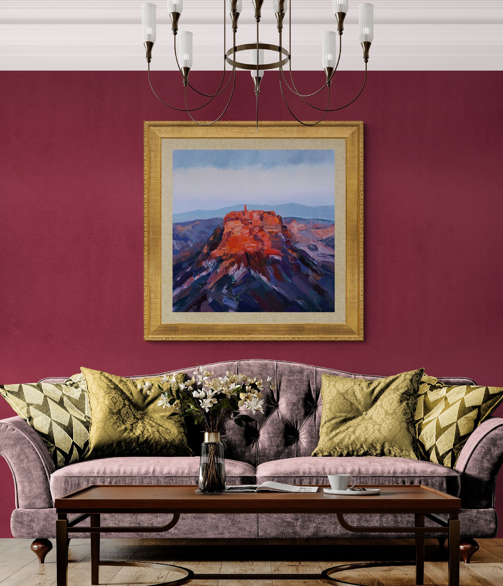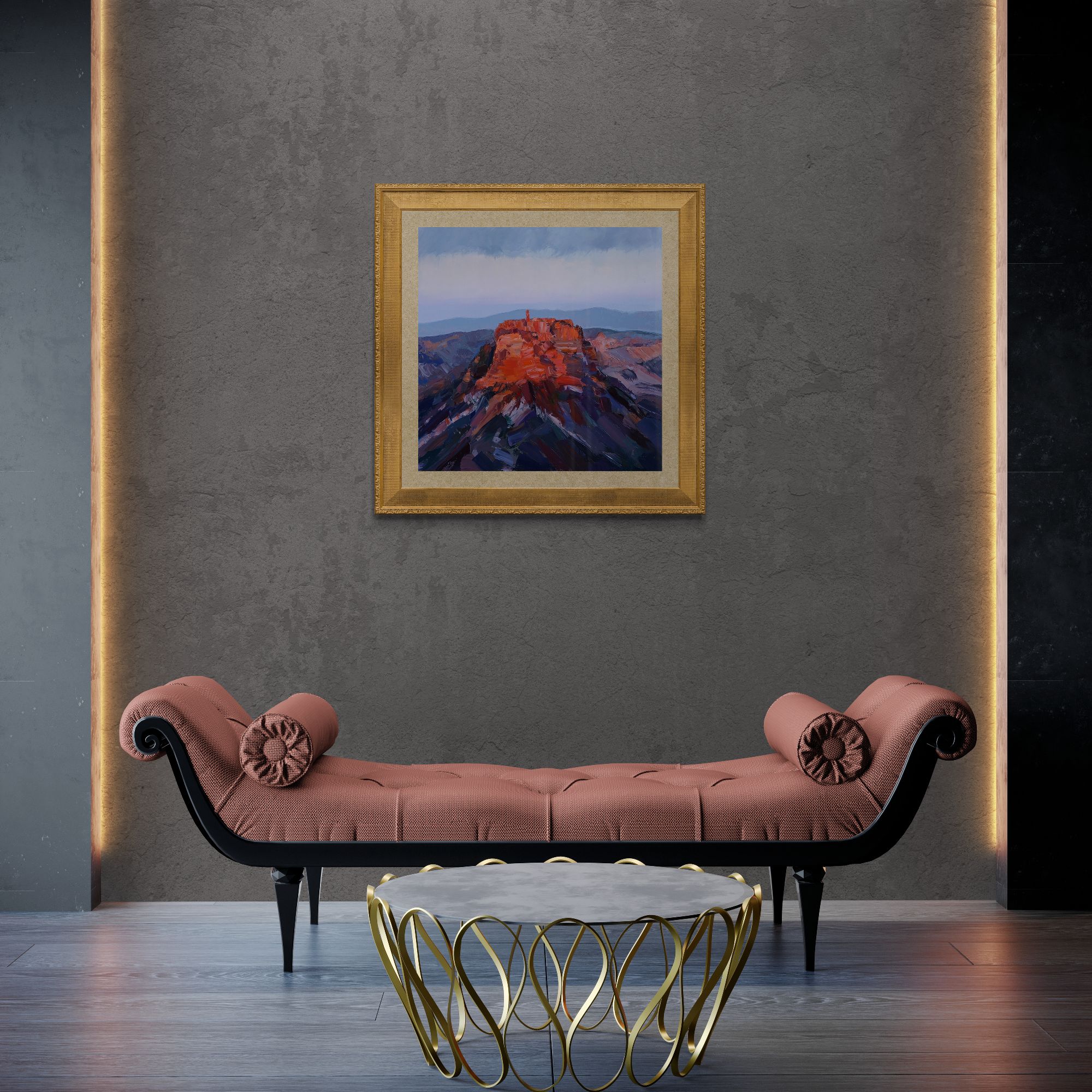 view of the inhabited block of Civita di Bagnoregio; characteristic and magical place of ancient memory located in southern Tuscany. I tried to capture the essence of the shapes and model the color and light with the palette knife.
