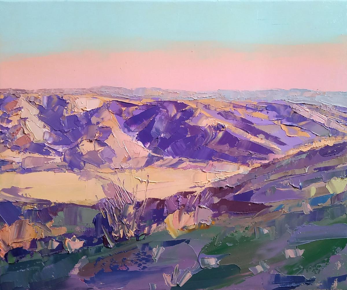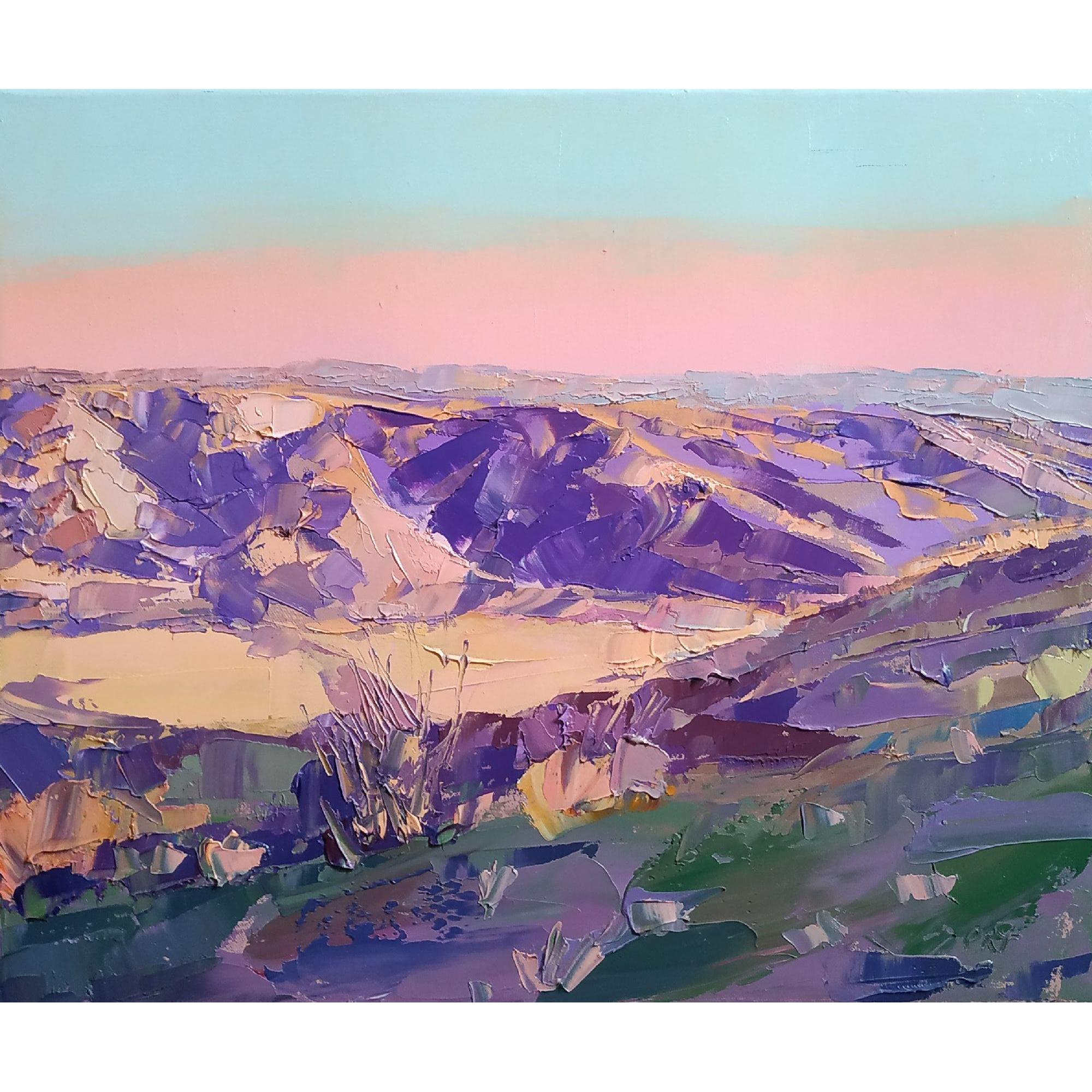 original painting, oil on canvas. At the moment of the beginning of sunset, catch the sky and the earth painting strange shapes in the Sienese crags.