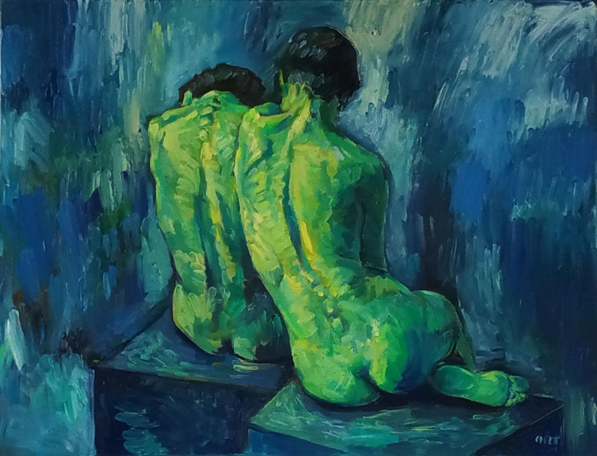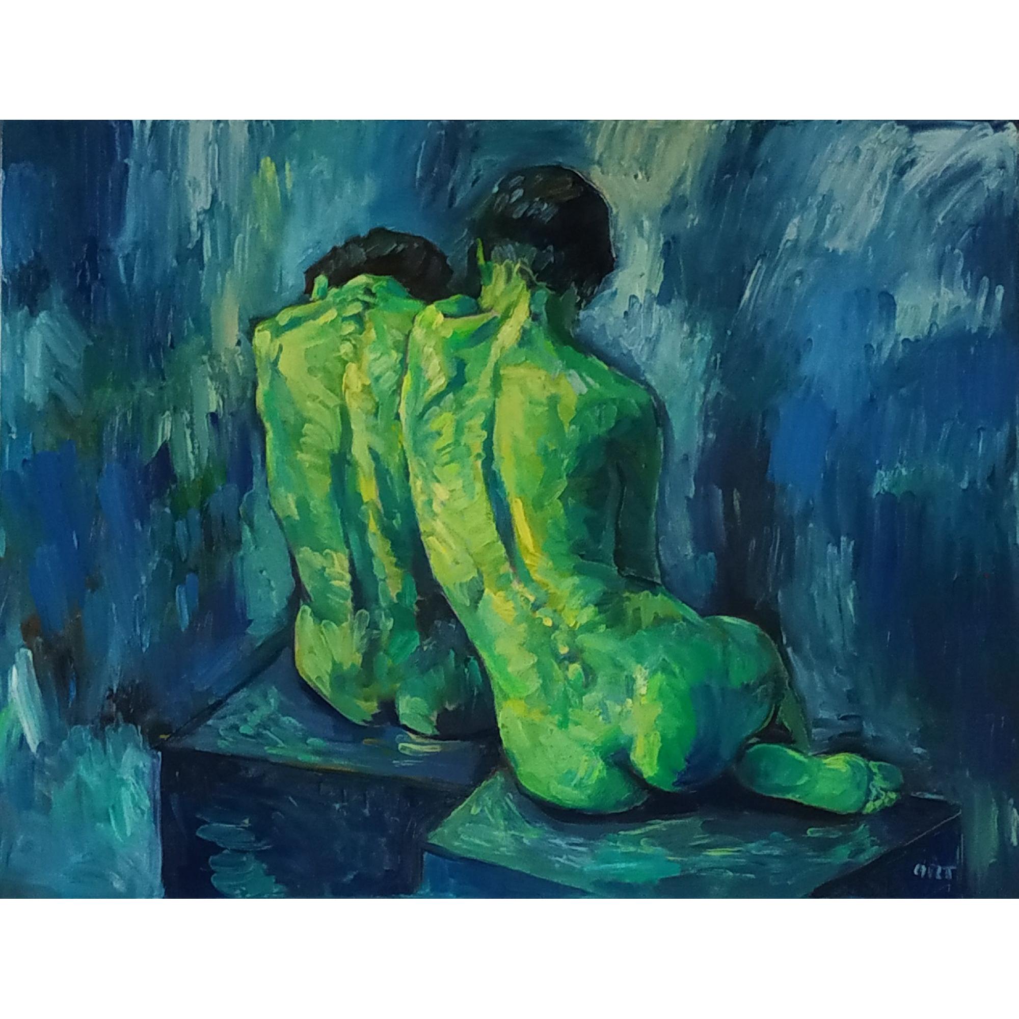 Opera dipinta con le mani ad olio su tela, i corpi riflettono tonalità di azzurro ricordandoci la nostra origine celeste, dall'universo proviene l'umanità e sulla terra viviamo la dualità tra amore e sofferenza.