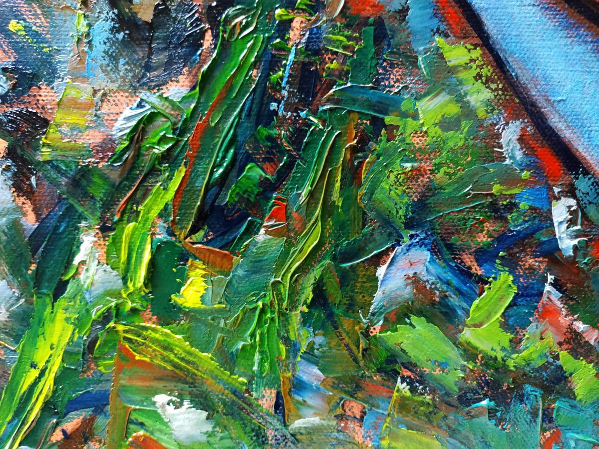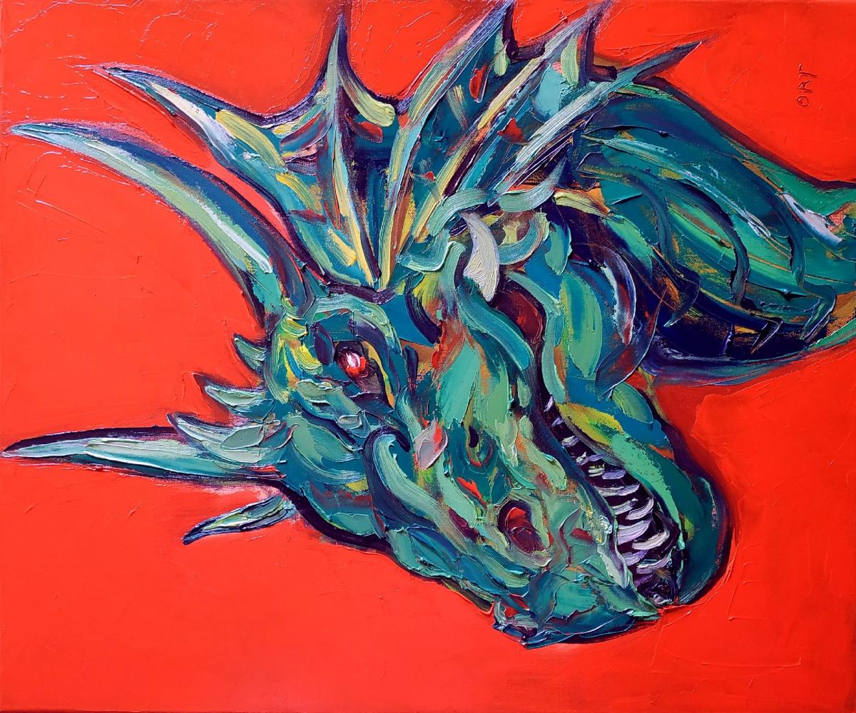 L’opera del drago è realizzata in olio su tela con una resa molto materica, segni evidenti di spatola e una palette che include verdi, blu profondi e contrasti forti, che suggeriscono energia dinamica, movimento “vivo” e non solo figura decorativa. (Visibile nelle opere su piattaforme come Singulart / Saatchi Art).